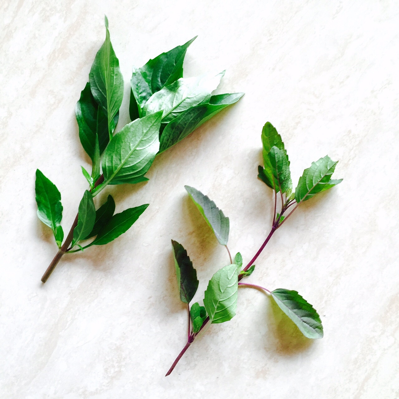 The one to the right is Kra Prow (holy basil) leaves. It is rare to find these leaves in Northern Virginia, Washington DC metropolitan area. I would trade saffron with KraProw. You will find Kra Prow Leave using in Pad KraProwGai- stir fired basil chicken, PoTak- seafood soup topped with kra prow( a cousin to Tom Yum soup), PadKeeMow- drunken noodle, just to name a few. The one to the left is Thai basil leaves. Thai basil has good flavor when stir fried with meat of any kind. But mostly it is used for garnish. It releases herby oil over fried garlic chili on the heat. KraProw, on the right, will give even more complex smell and flavors. It gives you basil flavor plus hay and a little spice. KraProw is so good and it is not thai basil, these are two different things.
